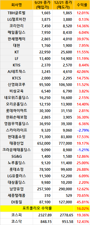 마법공식의 EV/EBITDA를 PBR로, ROC를 GP/A로 바꾼 신마법공식 1.0의 수익률을 살펴보겠습니다. 9월 29일 종가 매입, 12월 21일 종가 매도 기준 수익률입니다.