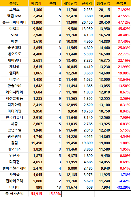 이번 주 매수 종목은 인산가입니다. 이디티는 유상증자를 했습니다. 허허허. 포트폴리오 내 유일한 동전주인데 회복이 쉽지 않군요.